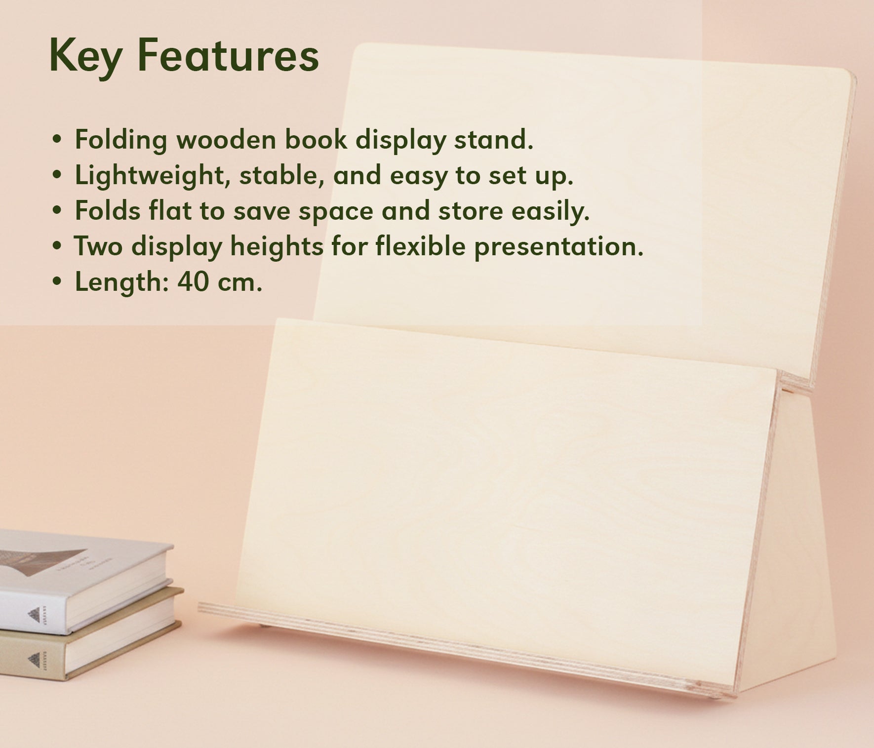Il permet d'exposer les livres à deux hauteurs différentes : 40 cm de longueur et 20 cm de hauteur.